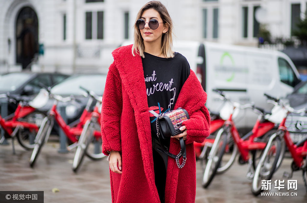 ??? 當(dāng)?shù)貢r間2017年12月5日,德國漢堡,時尚博主Aylin Koenig街拍。她戴Dolce & Gabbana黑色圓框墨鏡,身穿Max Mara紅色羊羔毛大衣,內(nèi)搭Saint Laurent黑色字母紅唇印花衛(wèi)衣,手拎Chanel粗呢拼接鏈條包,下穿Asos黑色漆皮緊身皮褲,腳踩Valentino黑色金屬釘鑲嵌系帶短靴。