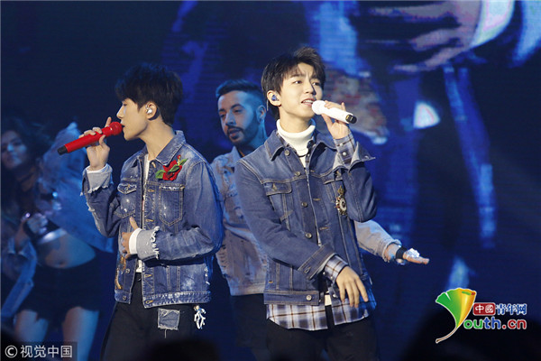 ??? 北京,12月12日晚,王俊凱、易烊千璽現(xiàn)身某活動,兩人身穿牛仔外套獻唱嗨翻全場,又換上紅色衛(wèi)衣舉廣告宣傳標語
