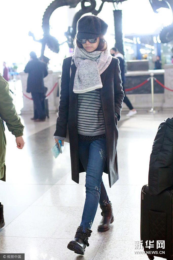 林心如報童帽黑色大衣鉚釘靴 知性優(yōu)雅