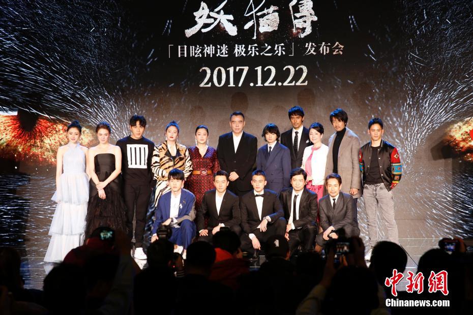 12月17日,由陳凱歌導(dǎo)演的賀歲奇幻題材電影《妖貓傳》在北京舉行全球首映發(fā)布會(huì),導(dǎo)演陳凱歌,制片人陳紅攜主演黃軒、染谷將太、張雨綺、秦昊、張榕容、張魯一、劉昊然、阿部寬、松坂慶子等亮相。影片改編自日本作家夢(mèng)枕貘的魔幻系列小說(shuō)《沙門(mén)空?!罚瑢⒂?2日起在中國(guó)內(nèi)地上映。圖為眾主創(chuàng)合影。