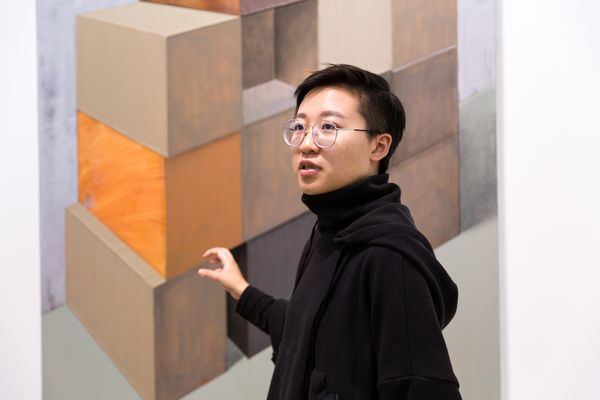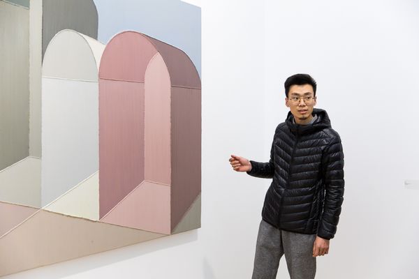 藝術(shù)家趙新宇,1989年出生于內(nèi)蒙古,2012年畢業(yè)于四川美術(shù)學(xué)院油畫系。趙新宇最早的創(chuàng)作,即為人所知的“車廂”系列,涉及了一種日常經(jīng)驗(yàn),后續(xù)階段的作品以情緒性和敘事性為底色,而使得整個(gè)畫面頗具戲劇色彩。在新作當(dāng)中,這一痕跡的延伸則是趙新宇似乎試圖通過對(duì)畫面結(jié)構(gòu)的編排,對(duì)比之前的作品,依舊是在構(gòu)景,但卻在逐漸在取締物的現(xiàn)實(shí)性因素。新作當(dāng)中技法的轉(zhuǎn)變,厚涂式的平推僅保留了一部分,新作當(dāng)中的轉(zhuǎn)向在某種程度上僅僅構(gòu)成了對(duì)于厚涂畫法的一個(gè)對(duì)立面發(fā)生,像是一次新的開場(chǎng),畫面本體基本問題再次噴涌而來(lái),在這一情形下,趙新宇通過對(duì)于框架結(jié)構(gòu)式描繪的轉(zhuǎn)向,試圖引向一種對(duì)于畫面心理的感知。