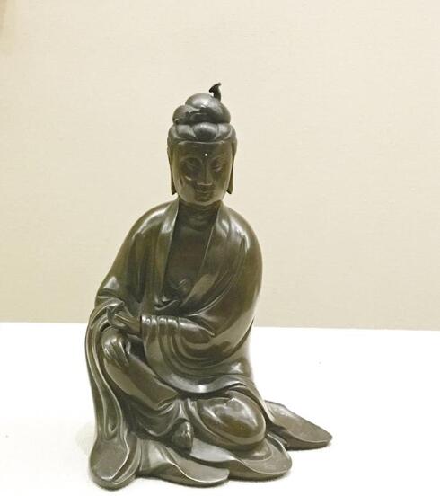 其中,最引人注目的莫過于展覽海報上呈現(xiàn)的“景德鎮(zhèn)白釉瓷塑觀音菩薩像”,產(chǎn)于南宋時期,整尊瓷塑構思既簡約又精巧,以粗線條捏塑形體與衣紋,胸前瓔珞精致,人物形象傳神,充分展現(xiàn)了宋代瓷塑藝術的審美意韻與高超技藝。令人嘖嘖稱贊的還有明中晚期的“銅觀音菩薩像”。此像采用暹羅國(今泰國)所貢優(yōu)質(zhì)風磨銅鑄造,工藝精細,撫之如嬰兒肌膚,嵌銀絲,背后銀絲鑲嵌方章銘款“石叟”二字,當出自石叟本人之手。據(jù)了解,石叟為明代晚期鑄銅塑像名匠,僧人身份,現(xiàn)存中晚明觀音銅像中尚有部分“石叟”款,真品珍貴稀罕。