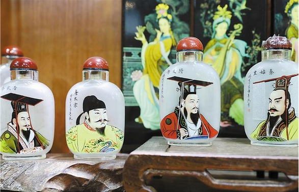 談及創(chuàng)作過(guò)程,楊藝說(shuō),鼻煙壺內(nèi)畫(huà)的制作,一般是在水晶壺或素玻璃壺內(nèi)壁,用特制的細(xì)筆,蘸取少許墨汁顏料,從小口中深入瓶中,反手作畫(huà)。創(chuàng)作內(nèi)畫(huà),在常人看來(lái),不可思議之處是有限的空間以及需要反手作畫(huà),這也是每一個(gè)內(nèi)畫(huà)師面臨的主要難題所在,“創(chuàng)作內(nèi)畫(huà)時(shí),需要在這盈寸天地間做到手指和筆桿揮灑自如,這極其考驗(yàn)一個(gè)人的耐性。一手執(zhí)壺,一手作畫(huà),作畫(huà)時(shí)需要在壺內(nèi)反手描繪,如此,才能讓人們?cè)谕獠靠吹秸娴漠?huà)像結(jié)構(gòu)。”內(nèi)畫(huà)的難度還在于,要長(zhǎng)期低頭畫(huà)畫(huà),因此還導(dǎo)致頸椎疼痛,中途為了治療疼痛休畫(huà)了好長(zhǎng)一段時(shí)間。
