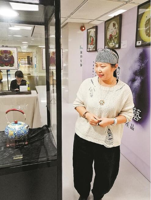 展臺前的景泰藍(lán)銀器茶壺精致漂亮,典雅高貴,它的制作者山西銀滿樓景泰藍(lán)公司技術(shù)總監(jiān)吳鳳芳在景泰藍(lán)行業(yè)已經(jīng)耕耘36年。她在上世紀(jì)90年代成功將傳統(tǒng)的銅胎掐絲景泰藍(lán)革新品種,研制成功銀胎掐絲琺瑯,并于2012年獲得的國家技術(shù)發(fā)明專利。