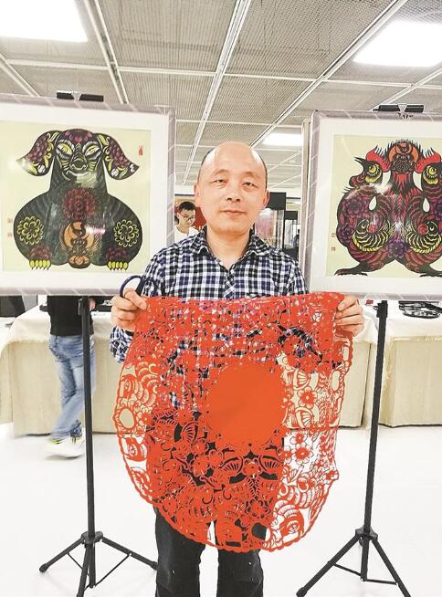 在展覽現(xiàn)場,山西剪紙非遺項目傳承人、工藝美術(shù)大師游洋(又名石羊)給觀眾演示出神入化的剪紙藝術(shù),手握一把剪刀游刃有余,眼花繚亂間已剪出復(fù)雜精美的狗年圖案。
