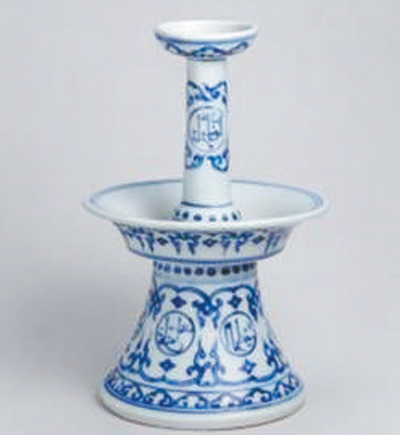 這是一件明正德年間的青花燭臺。燭臺很復(fù)雜,由四部分組成,最上端為蠟燭插口,外壁繪如意云頭紋;其下為燭臺細(xì)長支柱,中部繪圓形開光,開光內(nèi)書寫阿拉伯文,上下分別繪勾蓮花枝紋及菱形紋。再下為承托圓盤,也繪如意云頭紋;最下端為喇叭形臺座,也繪圓形開光,開光內(nèi)書寫阿拉伯文,開光上下分別繪勾蓮花枝紋及菱形紋。燭臺上的阿拉伯文與傳統(tǒng)紋飾,表現(xiàn)出阿拉伯文化與中華傳統(tǒng)文化的交融。