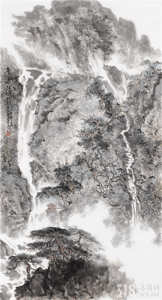山水之所以成為中國繪畫的永恒主題,跨越時空,也在于“自然”這一永恒主題是人類心中的凈土。與卡拉揚所說的以巴赫音樂“校正視聽”同出一轍,山水藝術(shù)家籍借山水畫,作為修煉自我的一條途徑。與音樂一樣,山水畫既有抽理的邏輯,又有造化的邏輯。師造化能有溫度,抽理能讓我們的心靈得到升華與純凈,我們的手、眼、心在師造化和抽理中,最后達到師物游心、物我兩忘之境。范陽先生終年隱居江西武功山和楊岐山,師造化使他筆下的丘壑、林泉、松石,高曠而有真意,不落程式窠臼。早年潛心古法研究,謙遜問學(xué),轉(zhuǎn)益多師。門庭既闊,筆墨則不得不精,眼界既寬,格調(diào)則不得不高。近年的作品,更從早年的細(xì)膩綿密,化而為奔放渾厚。其畫不論大作或小品,首取氣韻,不營營于一草一木,放逸中卻又能見綿密細(xì)致。又以草情筆法入畫,于平直處流露其錚錚骨骼及磊磊性情,飛動處可見其心瀾翻動,觀其作,可想見其作畫時心手雙暢之態(tài),如汩汩之泉,一瀉千里而不得止,非長年積養(yǎng)之功不可得哉。
