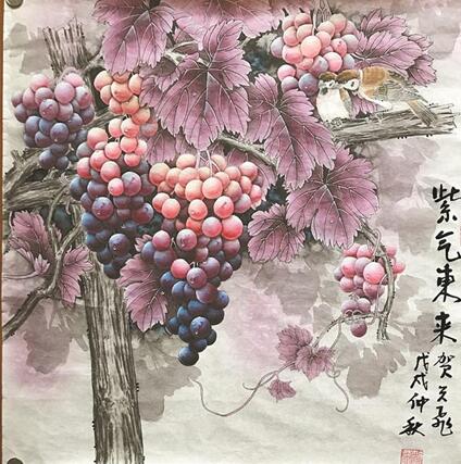 仔細觀察他筆下的葡萄,那密密實實、郁郁蔥蔥的葉子下,葡萄掛滿了架。有的紫紅色,有的青綠色,像瑪瑙,晶瑩剔透的葡萄讓人饞涎欲滴,期間引來雀鳥駐足枝頭,享受著秋收的喜悅和精彩。賀天飛坦言,葡萄題材的創(chuàng)作并非一件易事。在四十多年中,他只畫了九十多幅葡萄圖。一幅斗方的葡萄他通常都要畫上五天到一周。此次展出的作品匯聚了五年來他對這一題材的創(chuàng)作成果。