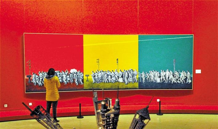 進(jìn)入中國(guó)美術(shù)館正中圓廳,巨幅三聯(lián)作《時(shí)代之歌——闖·創(chuàng)·窗》格外令人矚目。廣東省美術(shù)家協(xié)會(huì)副主席、深圳市文聯(lián)專職副主席梁宇向記者表示,“我畫(huà)的是不同時(shí)期的普普通通的深圳建設(shè)者,正是他們鑄就了深圳發(fā)展的奇跡?!?/p>