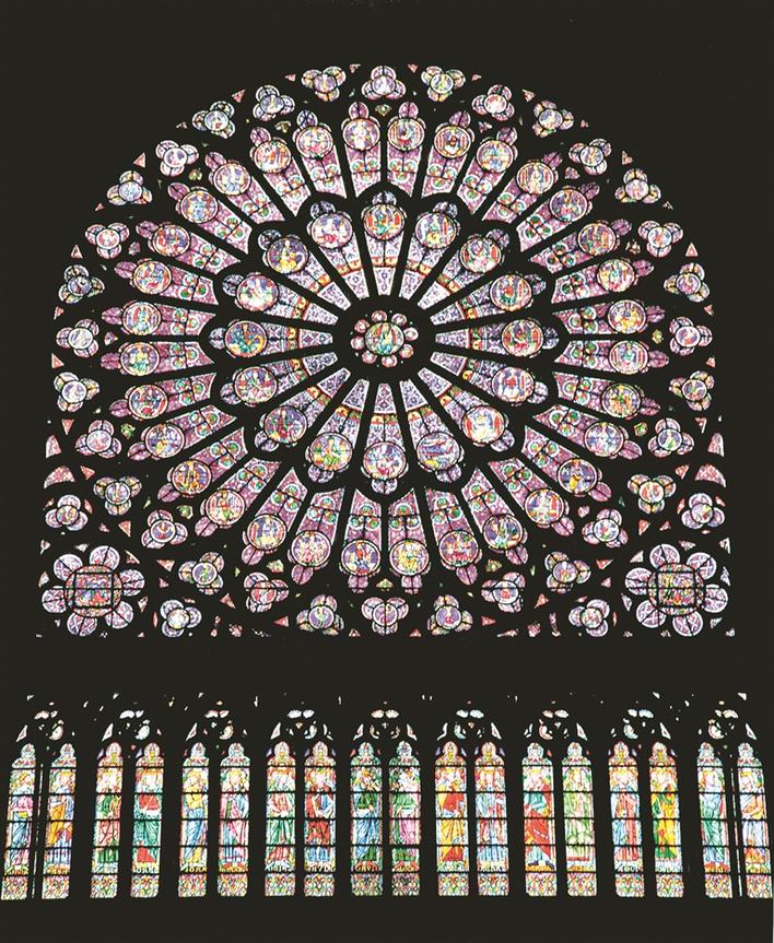 彩繪玻璃花窗“玫瑰花窗”也是巴黎圣母院內(nèi)的重要文物。18世紀(jì),巴黎圣母院在路易十四統(tǒng)治時期經(jīng)歷了一次大修,12世紀(jì)留下的彩色玻璃窗被換成了透明玻璃窗,只有三扇玫瑰彩色玻璃窗被保留下來,也成為圣母院如今的著名景觀之一。在雨果的小說《巴黎圣母院》熱銷后,巴黎民眾和政府官員開始呼吁對這一“寶藏”進(jìn)行修復(fù)。1844年,在建筑大師維歐勒·勒·杜克的帶領(lǐng)下,修復(fù)了圣母院的西立面、國王畫廊,還添加了十二圣徒雕塑以及圣母院屋檐上著名的怪獸雕塑。