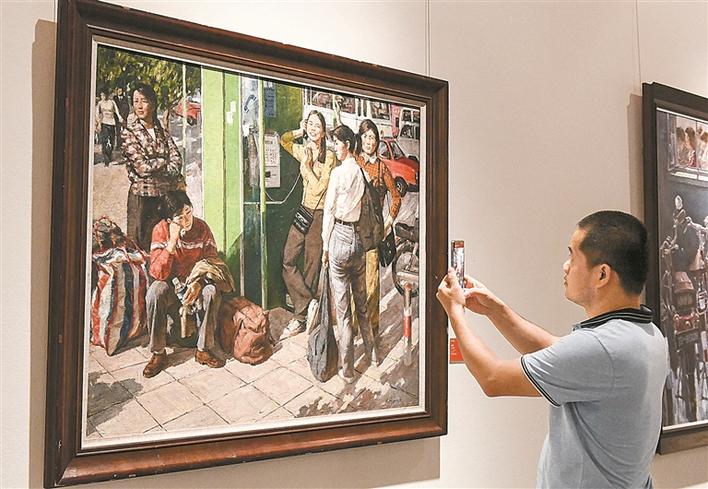 市民在深圳建市40周年美術作品展上拍攝留念。