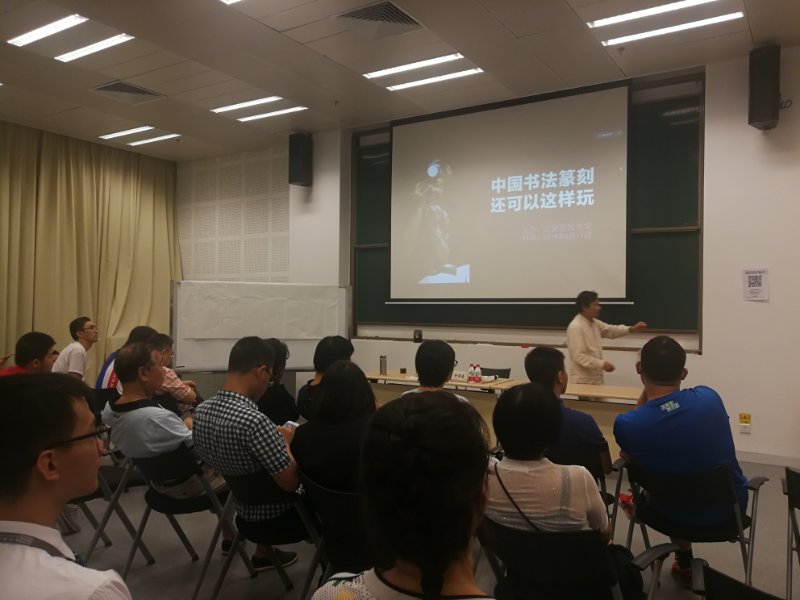 在2個(gè)小時(shí)的講座中,鐘國(guó)康妙語(yǔ)連珠,用生動(dòng)幽默的語(yǔ)言將博大精深的書法篆刻文化表現(xiàn)得淋漓盡致,講座現(xiàn)場(chǎng)掌聲連連。鐘國(guó)康認(rèn)為,書法篆刻之術(shù),只有筆性、墨性、石性、紙性、心性,全方位嚴(yán)謹(jǐn),筆力勁駿,心手相應(yīng),技藝熟練,才能做到庖丁解牛,勢(shì)如破竹,可進(jìn)可退,正可謂“惟習(xí)之至熟,自可心手相應(yīng)”。他還現(xiàn)場(chǎng)潑墨揮毫,演示篆書的寫法,詳細(xì)講解并現(xiàn)場(chǎng)演示了篆刻的方法,重點(diǎn)分享自己在單刀法和雙刀法上的獨(dú)特見解。單刀法要“有多狠刻多狠,有多猛刻多猛,有多深刻多深,有多長(zhǎng)線條刻多長(zhǎng)線條”,而雙刀法即在“單刀之回馬槍重刻一遍相反之單刀法”。一些幸運(yùn)的書法、篆刻愛好者還通過搶答的方式,獲贈(zèng)書法篆刻作品。(通訊員 孫善文)