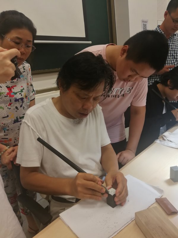 著名書法篆刻家鐘國(guó)康在講座現(xiàn)場(chǎng)演示篆刻的方法