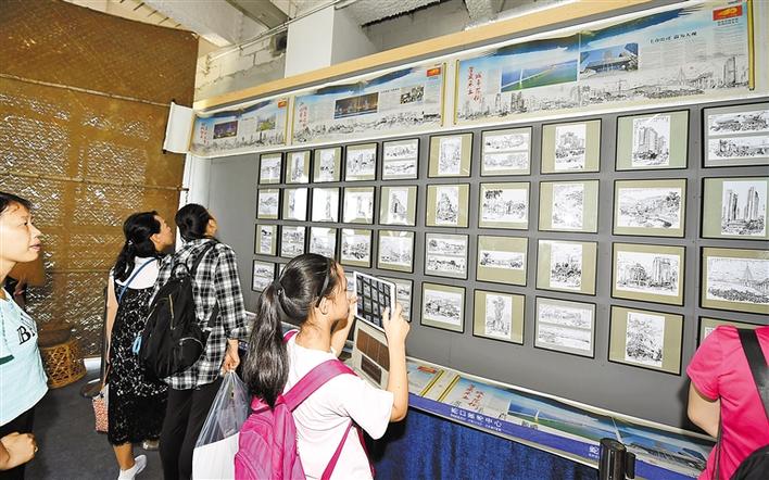 在現(xiàn)場的攝影作品、速寫作品上方,展示的于2018年12月8日《深圳商報》刊出的、中國報業(yè)印刷史上罕見的20連版、改革開放四十年紀念版圖繪新聞長卷,瞬間抓住了觀眾的眼球。記者看到,《深圳商報》獨具創(chuàng)新的4連版、5組(共20個版)的特殊設計版式,內(nèi)容以深圳美麗的風光圖片和深圳媒體人馮明《鵬城百景速寫》的繪畫結(jié)合形式,展現(xiàn)了深圳在改革開放40年間的經(jīng)歷。