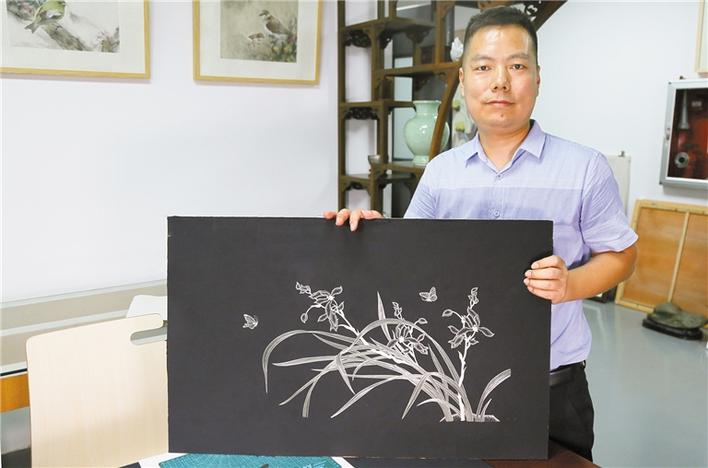 采訪現場,何俊剛向記者展示麥金畫的制作過程。首先是選麥,然后擇優(yōu)挑選,接著刨開、刮平、燙制、分料等,一片片金黃色的麥秸皮就完成了,裝箱備用。隨后,粘貼、書寫、刻制、上色、裝裱再壓光、裝鏡。何俊剛表示,刻制時既要精神集中,全神貫注,又要心平氣和,一絲不茍,心手合一才能把書寫字或畫稿,刻制而成。