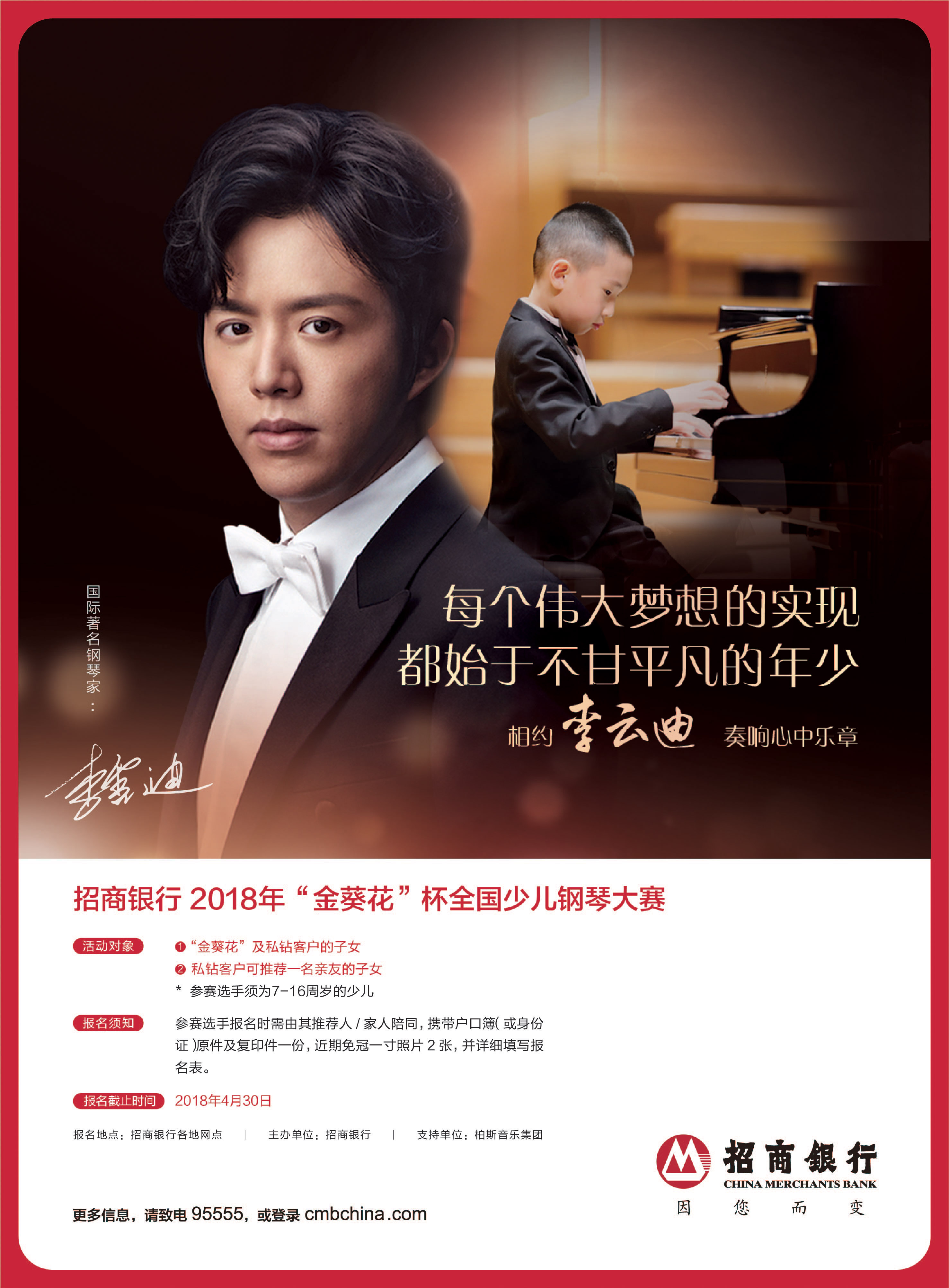 “李云迪公益大師班”將于7月總決賽期間舉辦, 入圍總決賽的選手可親臨大師班現(xiàn)場(chǎng)學(xué)習(xí),其他選手可通過招商銀行手機(jī)銀行觀看大師班視頻。最后,公益大使李云迪將帶領(lǐng)部分總決賽獲獎(jiǎng)選手共赴云南鄉(xiāng)村進(jìn)行公益探訪,將招商銀行和公眾的愛心化為“金葵花”音樂教室,送到鄉(xiāng)村的孩子們身邊。