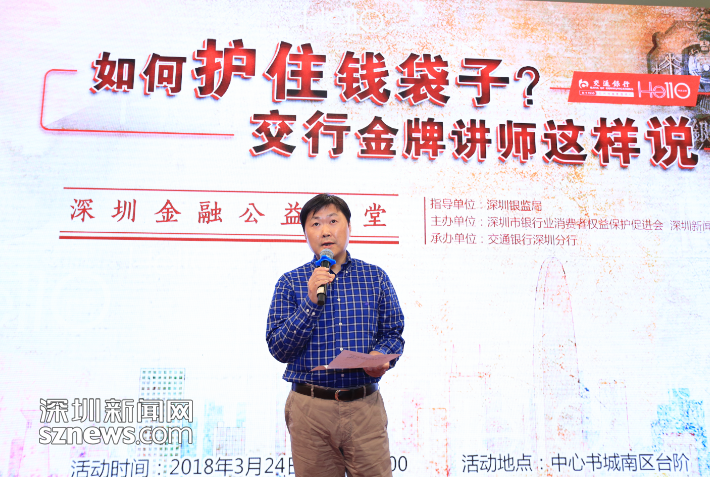 3月24日,在深圳中心書城南臺階,由深圳銀監(jiān)局指導(dǎo),深圳新聞網(wǎng)、深圳市銀行業(yè)消費(fèi)者權(quán)益保護(hù)促進(jìn)會主辦,交通銀行深圳分行承辦的大型系列公益活動“深圳金融公益講堂”第四講如期開講。活動邀請了來自交通銀行深圳分行的三位金牌講師從專業(yè)角度為市民朋友們詳細(xì)講解理財知識,現(xiàn)場解答市民的金融消費(fèi)困惑。
