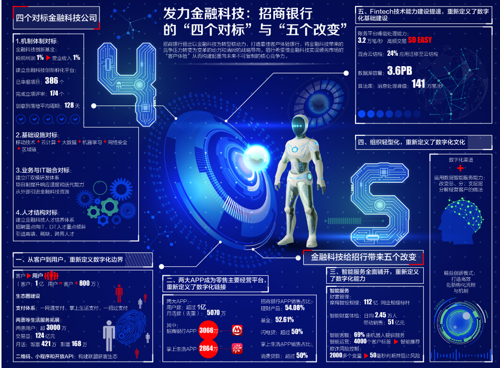 “關(guān)鍵不是我們擁有什么科技,而是我們怎么去運(yùn)用科技,怎么運(yùn)用金融科技的思維和精神?!?對于金融科技,招行董事會明確提出“容忍失敗,獎勵成功?!薄叭蒎e”文化對于經(jīng)營風(fēng)險,踐行審慎文化的銀行來說,可以說是顛覆式的。也就是說,招行為激勵創(chuàng)新,不僅打法在變革,理念及體制機(jī)制也都在轉(zhuǎn)變。