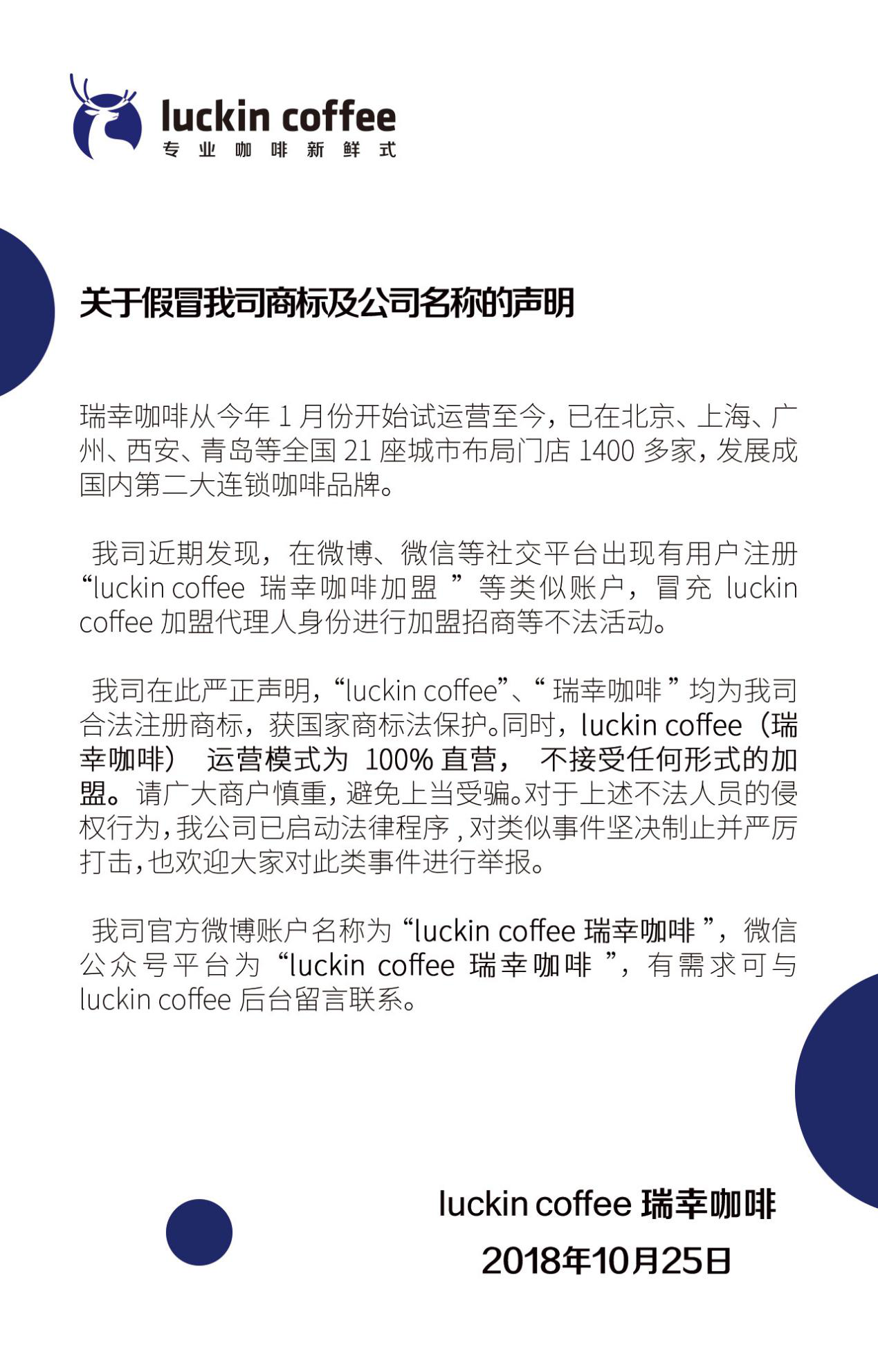 深圳新聞網(wǎng)訊 近日,瑞幸咖啡官宣聲明:我司近期發(fā)現(xiàn),在微博、微信等社交平臺出現(xiàn)有用戶注冊“l(fā)uckin coffee瑞幸咖啡加盟”等類似賬戶,冒充luckin coffee加盟代理人身份進行加盟招商等不法活動。luckin coffee瑞幸咖啡堅持運營模式為100%直營,不接受任何形式的加盟,請廣大商戶慎重,避免上當受騙。