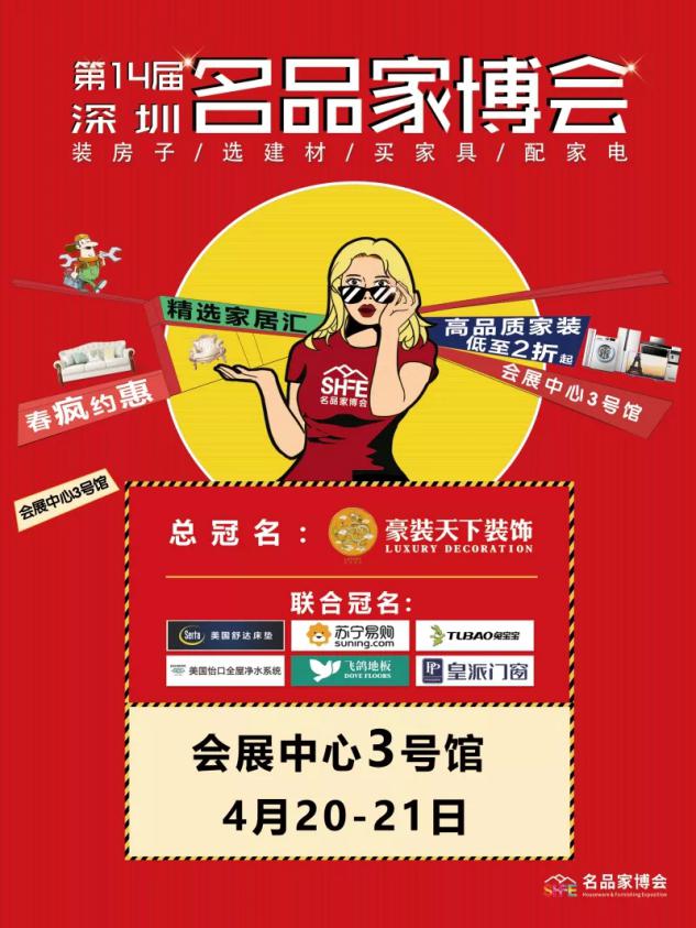 由豪裝天下裝飾集團(tuán)總冠名并聯(lián)合蘇寧易購、美國舒達(dá)床墊、飛鴿地板、皇派門窗共同助力的第14屆深圳名品家博會,將于4月20日—21日舉行在深圳會展中心舉辦。千余個家居一線品牌、萬余款家裝大牌產(chǎn)品齊聚本屆深圳家博會,將為深圳數(shù)萬裝修家庭帶來驚喜與福利。