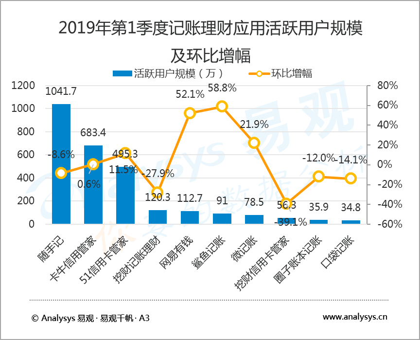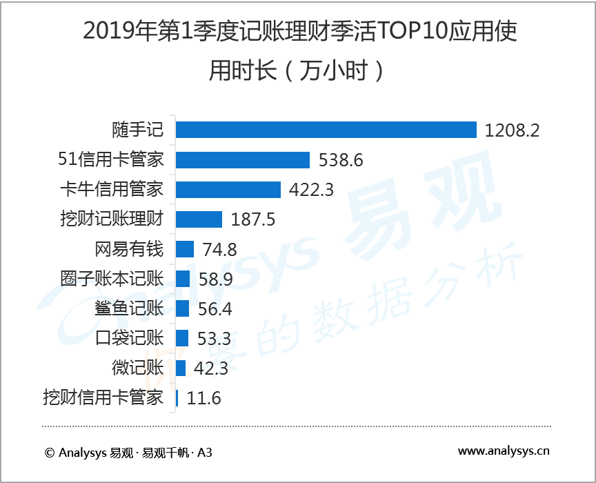 5月24日,知名互聯(lián)網(wǎng)數(shù)據(jù)研究機(jī)構(gòu)易觀 Analysys發(fā)布了2019年第1季度記賬理財(cái)行業(yè)報(bào)告,數(shù)據(jù)顯示,2019年第1季度,在國內(nèi)記賬類應(yīng)用中,隨手記以1041.7萬活躍用戶規(guī)模蟬聯(lián)榜首,卡牛信用管家和51信用卡管家分別以683.4萬和495.3萬活躍用戶規(guī)模居行業(yè)二、三位。