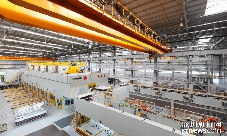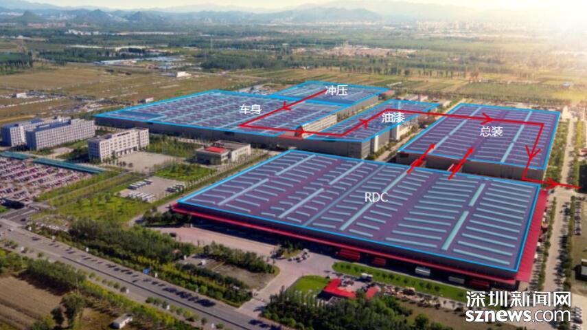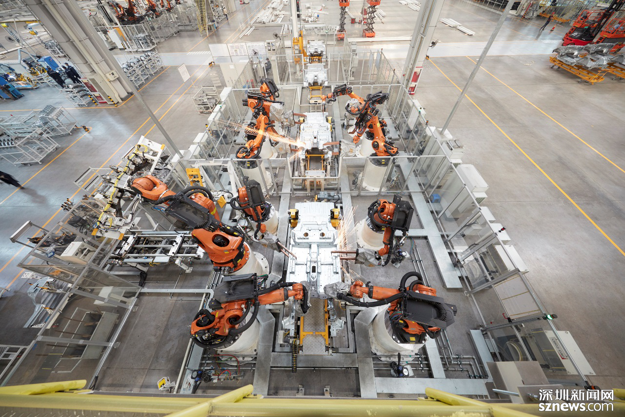 車身車間總占地面積9.9萬(wàn)㎡,采用互聯(lián)機(jī)器人、柔性NC定位系統(tǒng)、柔性?shī)A具切換系統(tǒng)、自動(dòng)化輸送系統(tǒng),標(biāo)準(zhǔn)化工藝體系、三層環(huán)網(wǎng)智能管理系統(tǒng)、國(guó)際安全標(biāo)準(zhǔn),主線自動(dòng)化率95%;采用柔性智能生產(chǎn)線,在同一條生產(chǎn)線可完成8個(gè)不同的車型無(wú)節(jié)拍損失自動(dòng)切換和混線生產(chǎn)。
