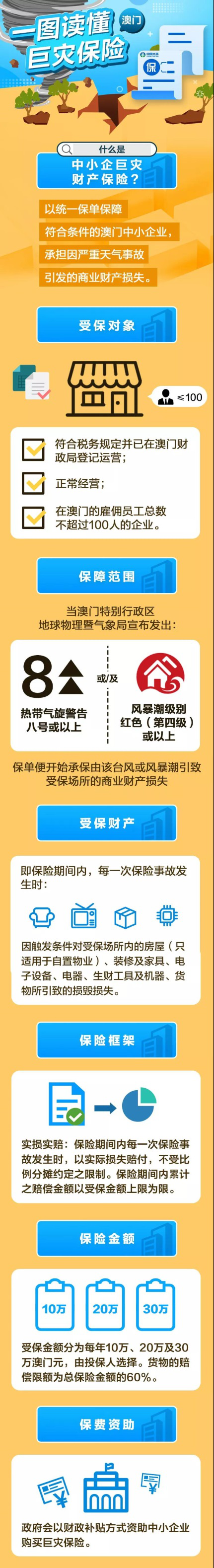 7月31日,今年首個(gè)臺風(fēng)“韋帕”來襲,香港、澳門氣象部門相繼懸掛8號風(fēng)球,并發(fā)布黃色風(fēng)暴潮警告。在持續(xù)強(qiáng)降雨和大風(fēng)之際,澳門金融管理局和經(jīng)濟(jì)局舉行聯(lián)合新聞發(fā)布會(huì),宣布推出“中小企巨災(zāi)財(cái)產(chǎn)保險(xiǎn)”,為中小企業(yè)在8號風(fēng)球/紅色風(fēng)暴潮或以上警告期間,所遭受的商業(yè)財(cái)產(chǎn)損失提供保險(xiǎn)保障。中國太平旗下太平澳門簽出中小企巨災(zāi)財(cái)產(chǎn)保險(xiǎn)第一單,為當(dāng)?shù)刂行∑髽I(yè)帶來定心丸。