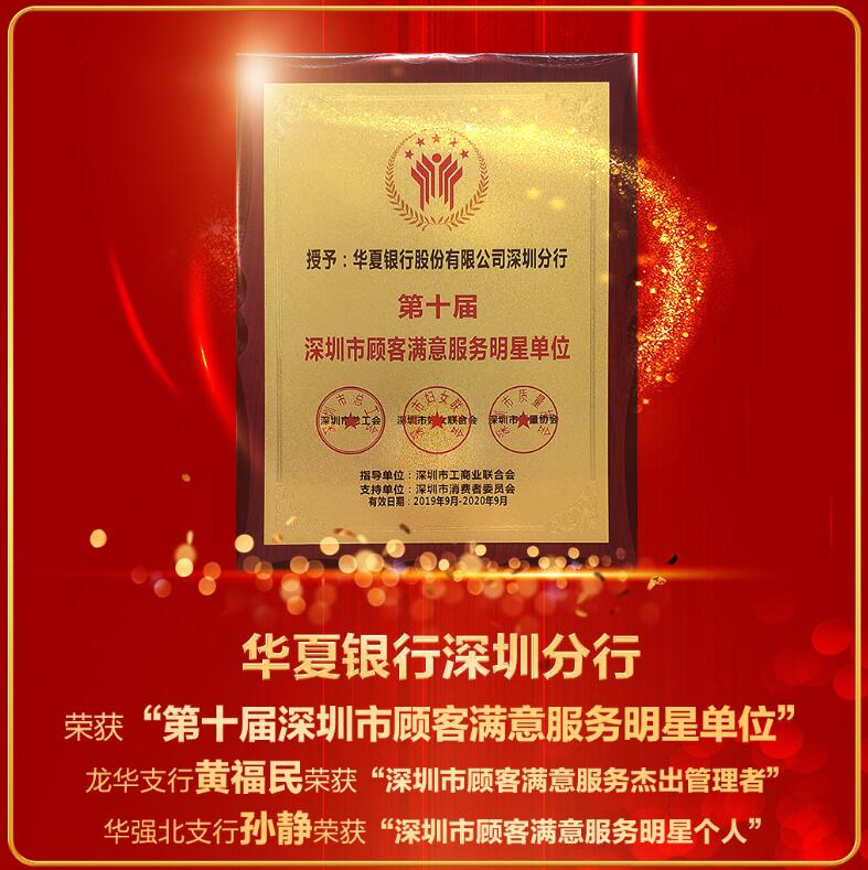 深圳新聞網(wǎng)訊 近日,華夏銀行深圳分行在“第十屆深圳市顧客滿意服務明星”暨“第二屆深圳市優(yōu)質服務示范單位”評選活動中,榮登“深圳市顧客滿意服務明星單位”榜首,“華夏服務”品牌影響力再次得到行業(yè)和客戶的高度認可。同時,該行龍華支行行長黃福民、華強北支行副行長孫靜分別獲得“深圳市顧客滿意服務杰出管理者”和“深圳市顧客滿意服務明星”榮譽稱號。