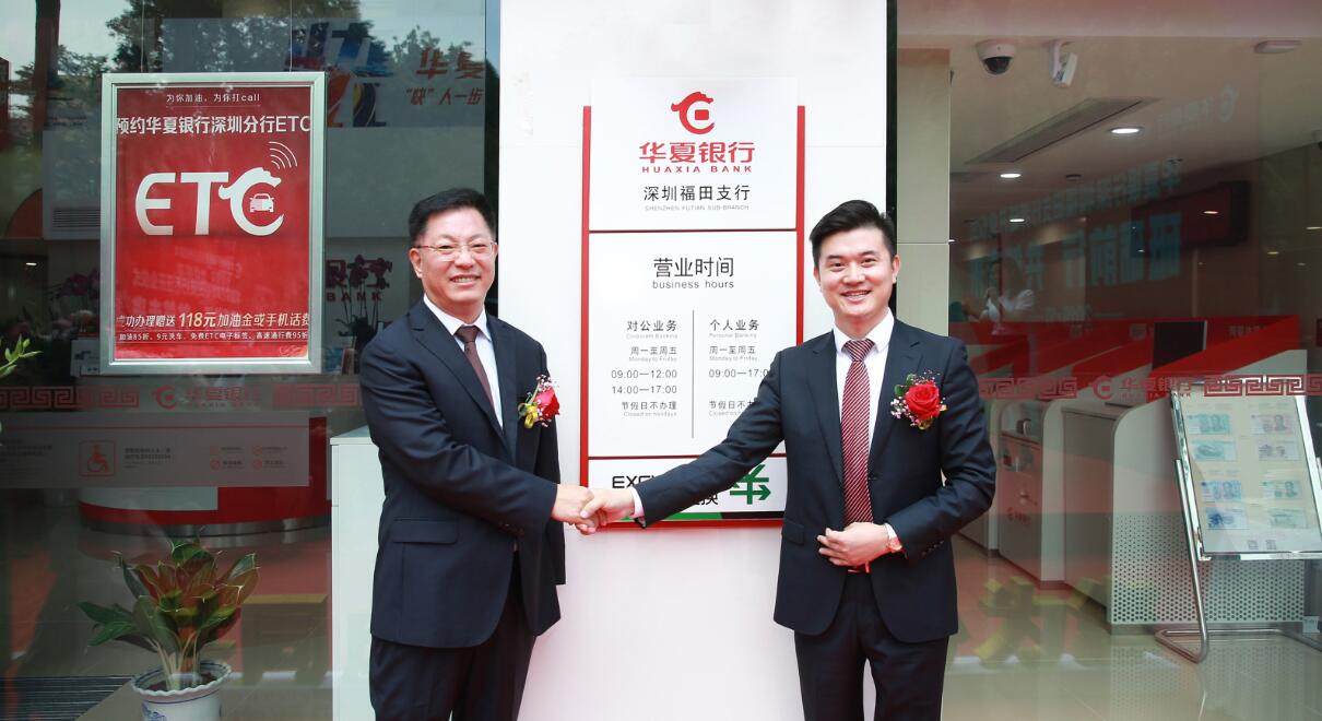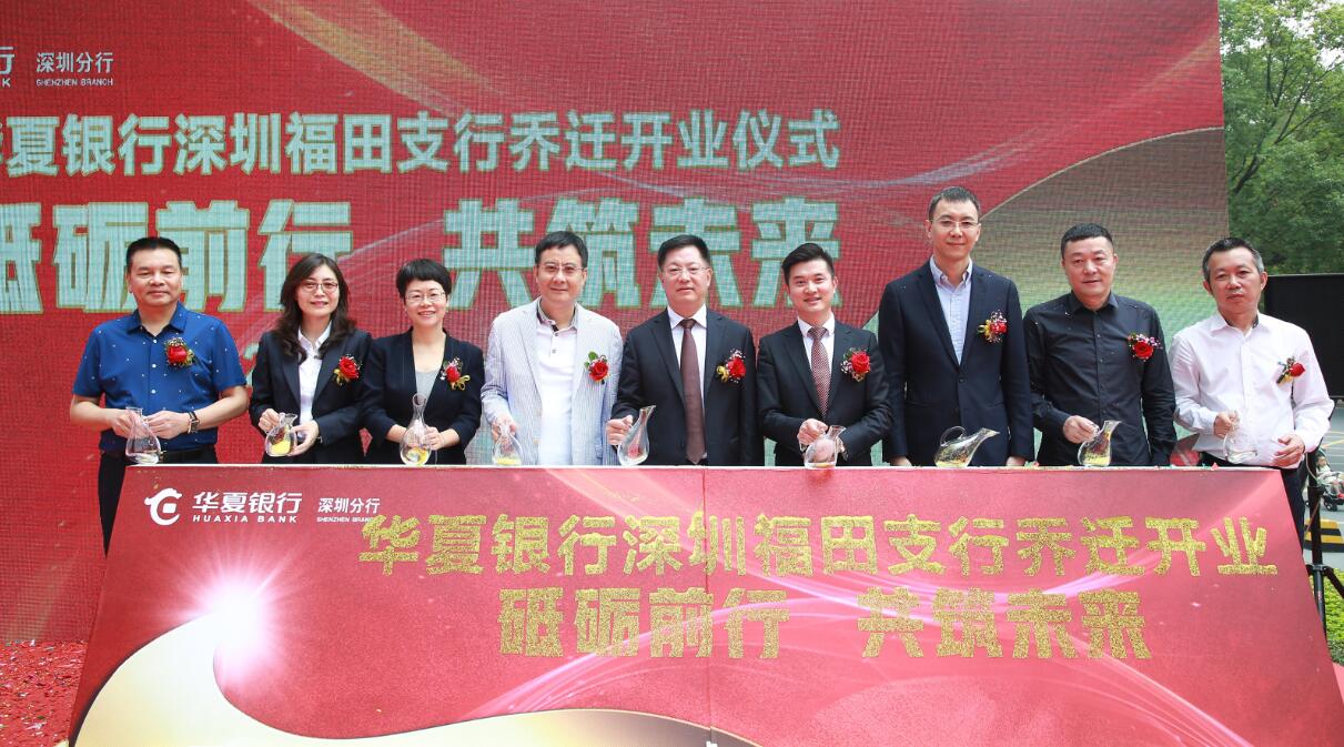 華夏銀行總行黨委委員、營銷總監(jiān)、深圳分行行長陳傳龍(左一)為福田支行揭牌
