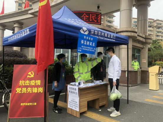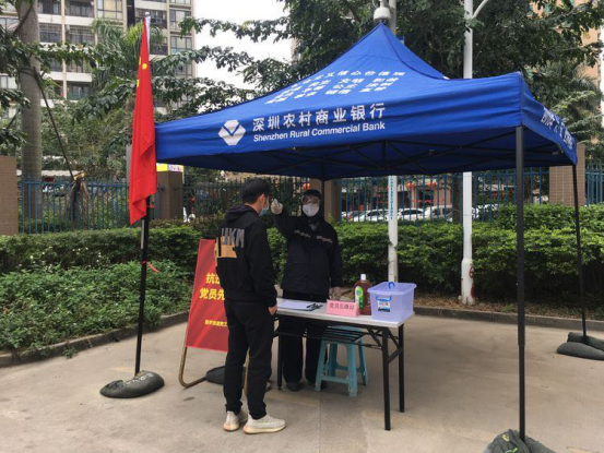 隨著疫情防控形勢(shì)的發(fā)展,深圳各街道各社區(qū)都不斷加強(qiáng)疫情防控,在道路口、社區(qū)出入口、樓棟出入口對(duì)進(jìn)出車輛和人員進(jìn)行篩查。在燕羅街道、松崗街道轄內(nèi)的道路卡口、社區(qū)門口、街道養(yǎng)老院、工廠等防疫檢查站點(diǎn),記者看到很多印有深圳農(nóng)商行名稱的藍(lán)色帳篷。一頂頂帳篷就像一把把‘保護(hù)傘’,為防控工作人員提供了遮風(fēng)擋雨的場(chǎng)所,也守護(hù)著轄區(qū)居民的健康。