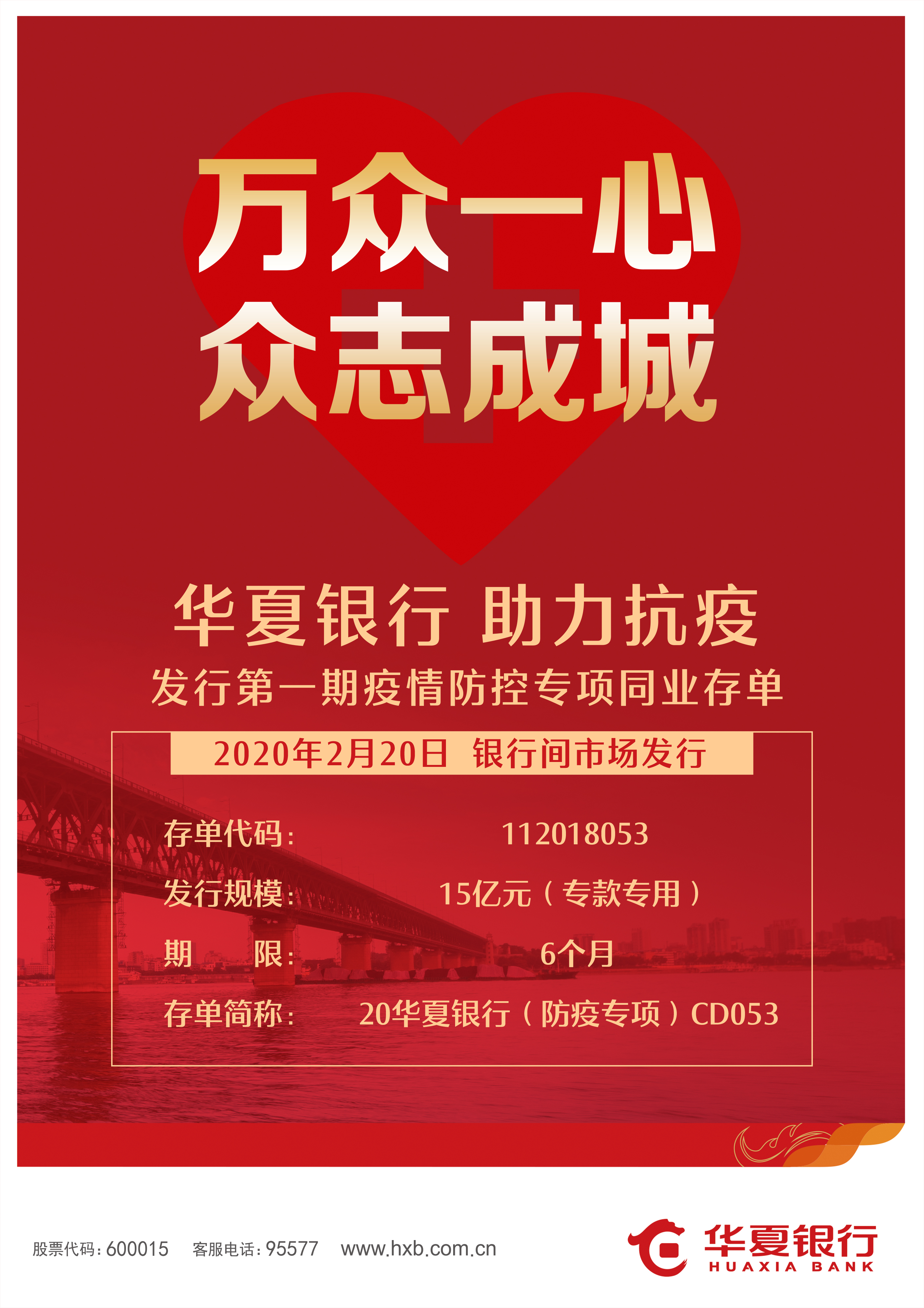 華夏銀行迅速響應(yīng)人民銀行疫情防控相關(guān)工作要求,于2月20日在全國(guó)銀行間市場(chǎng)成功發(fā)行疫情防控專項(xiàng)同業(yè)存單,為疫情防控提供資金支持。