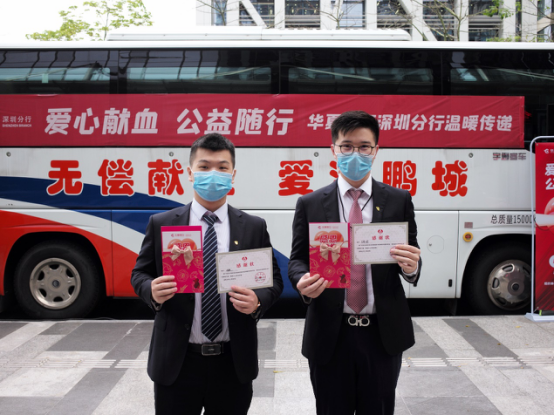 華夏銀行深圳分行行領(lǐng)導(dǎo)先后看望、慰問獻血員工。深圳市血液中心向華夏銀行深圳分行頒授感謝獎牌,深圳分行孫海強副行長代表分行向血液中心捐贈1000只口罩。