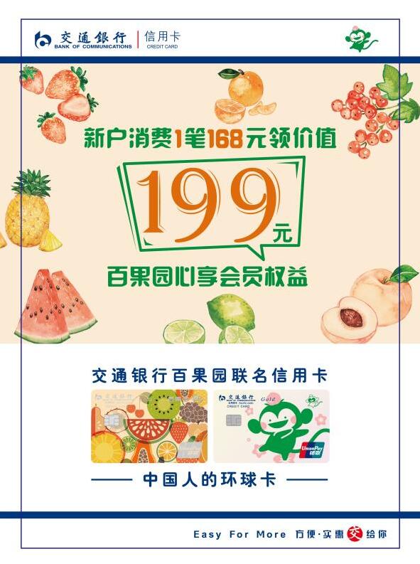 即日起至2020年12月31日,成功核發(fā)指定交通銀行百果園聯(lián)名信用卡主卡的新客戶,自核卡日起45天(含)內(nèi)使用該指定交通銀行信用卡滿足1筆單筆為168元(含)以上的消費(不含取現(xiàn)、轉(zhuǎn)賬),即可于核卡日60天內(nèi)(含)至買單吧APP使用5積分換購價值199元的百果心享會員權(quán)益。