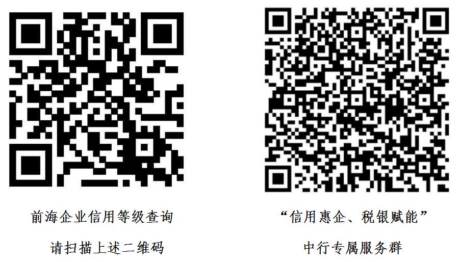 前海注冊企業(yè)可通過下左二維碼查詢前海信用等級,可通過下右二維碼加入“信用惠企、稅銀賦能”中行專屬服務(wù)群(入群請備注企業(yè)名稱),了解咨詢深圳中行針對前海“碧藍(lán)企業(yè)”和“湛藍(lán)企業(yè)”的十項具體服務(wù)內(nèi)容。(黃璜)