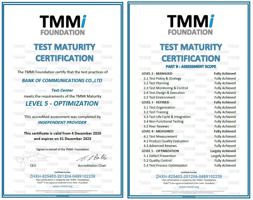 TMMi認證是當前國際上最權威的測試組織成熟度認證體系,也是軟件產(chǎn)品質(zhì)量管理水平最有力的資質(zhì)證明,最高級別為五級。此次獲得五級認證,標志著交行的軟件測試能力、產(chǎn)品質(zhì)量管理水平、風險應對能力、測試過程改進能力、測試技術創(chuàng)新能力的整體成熟度均已達到國際領先水平。