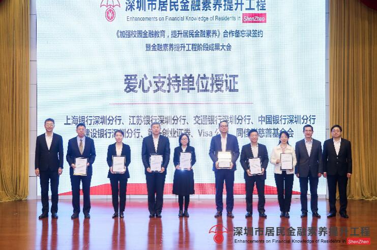 在隨后的授證儀式中,上海銀行深圳分行因?qū)ι钲谑芯用窠鹑谒仞B(yǎng)提升工程做出的突出貢獻(xiàn),及推動深圳金融安全建設(shè)與可持續(xù)發(fā)展,被授予了“愛心支持單位”榮譽(yù)稱號。