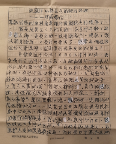 “事發(fā)第二天,該行行長又派陳學(xué)年、李美芳兩位員工到我家探望、慰問,讓我全家非常感動?!?月29日下午,傷口剛剛拆線的老人就帶著手寫的感謝信來到深圳農(nóng)商行黃閣坑支行,向幫助過他的兩位熱心人表達(dá)感謝之情。感謝信整整三頁紙,字跡工整,老人家的誠摯感謝之意躍然紙上。