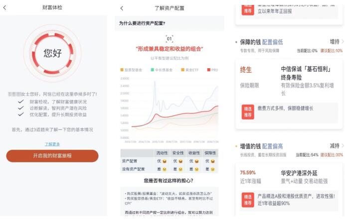 2020年8月,中信銀行的app上線了“財富體檢”功能。據(jù)介紹,這是一套基于歷史數(shù)據(jù)回測構建財富評價的模型,可以基于客戶的財富水平、風險偏好以及所處生命周期,動態(tài)檢視客戶財富配置狀況,并提供針對性的資產(chǎn)配置建議和產(chǎn)品推薦。