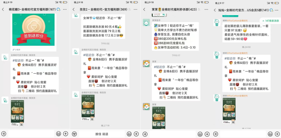 為了提升活動(dòng)效果以及節(jié)日噱頭,招行深圳分行積極向商戶爭(zhēng)取了全棉時(shí)代的直播禮品,直播當(dāng)天全棉時(shí)代為招行用戶提供價(jià)值50萬的禮品,同時(shí)在宣傳端,為了打造活動(dòng)熱點(diǎn),全棉時(shí)代在超過500個(gè)社群內(nèi)進(jìn)行活動(dòng)推送,招行端也積極爭(zhēng)取總行資源,在App、微信視頻號(hào)及朋友圈進(jìn)行宣傳。