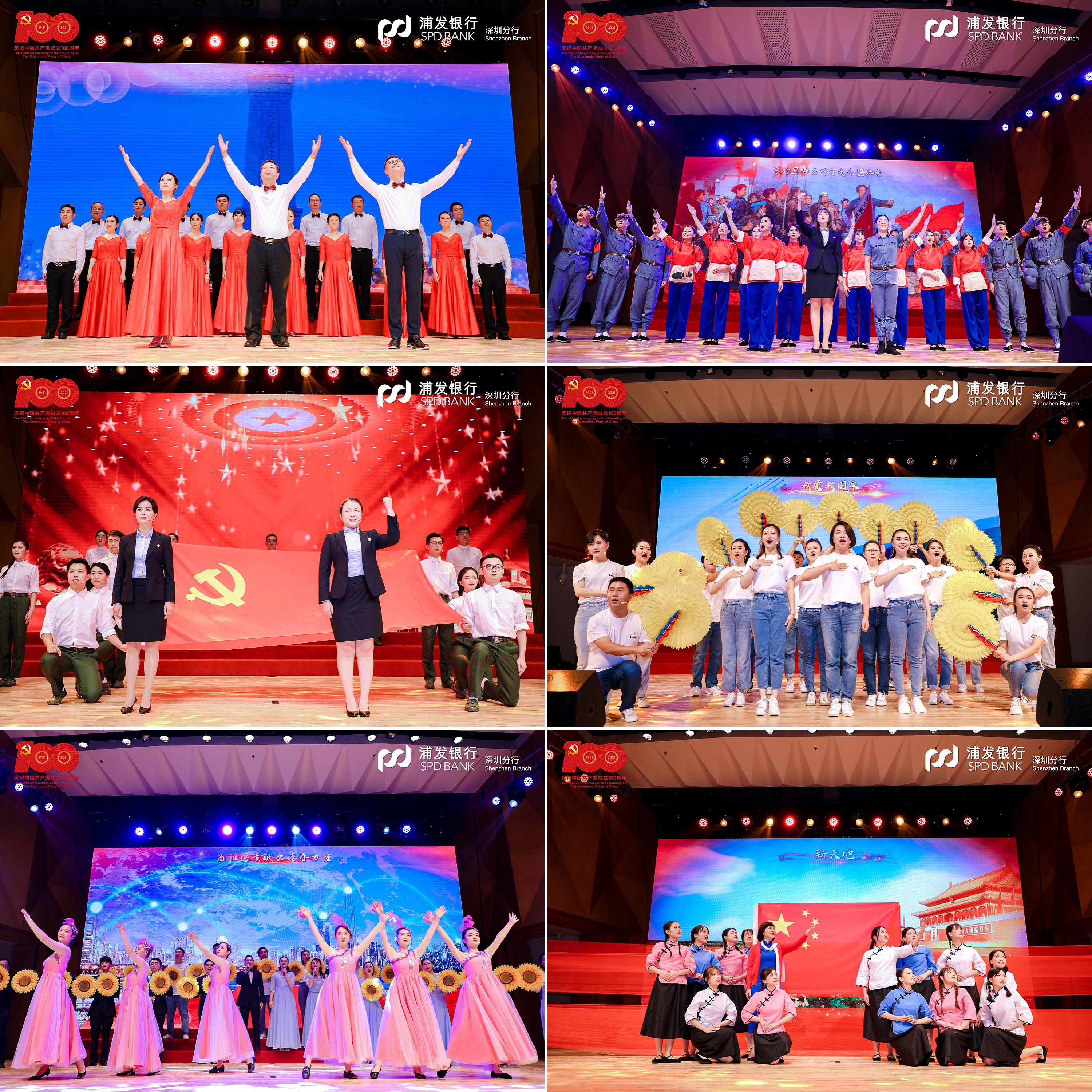 在黨支部風(fēng)采展示環(huán)節(jié),該行基層黨支部精心編排12首紅色經(jīng)典,通過4個篇章再現(xiàn)百年波瀾壯闊的偉大歷程。第一篇章“開天辟地”演繹了中國共產(chǎn)黨在新民民主義革命時期完成救國大業(yè)的輝煌歷程,《保衛(wèi)黃河》吹響了高亢嘹亮的愛國號角,《十送紅軍》深情演繹血濃于水軍民情,《繡紅旗》一腔熱血帶著大家重回歌樂山。第二篇章“改天換地”回顧了中國共產(chǎn)黨在社會主義革命和建設(shè)時期完成興國大業(yè)的奮斗史詩,《歌唱祖國》撥動人們最難忘的記憶,《我們走在大路上》展現(xiàn)當(dāng)年敢闖敢拼的奮進之姿態(tài),《唱支山歌給黨聽》唱出人民心中永恒的贊歌。第三篇章“翻天覆地”再現(xiàn)了中國共產(chǎn)黨在改革開放和社會主義現(xiàn)代化建設(shè)新時期推進富國大業(yè)的光榮壯舉,《在燦爛陽光下》重現(xiàn)春風(fēng)化雨之后的奮斗時光,《國家》打動多少人的赤子之心,《我們的生活充滿陽光》訴說了改革開放背后的喜悅。第四篇章“驚天動地”展現(xiàn)了中國共產(chǎn)黨在中國特色社會主義新時代推進并將在本世紀(jì)中葉實現(xiàn)強國大業(yè)的偉大時代,一首《天耀中華》是浦發(fā)人最深沉的表達(dá),《燈火里的中國》讓人漫步燈火漫卷的萬里山河,《再一次出發(fā)》展示浦發(fā)追夢者的雄姿英發(fā)。走過“百年風(fēng)雨”,浦發(fā)銀行深圳分行合唱團一首《我和我的祖國》,蓬勃朝氣盡顯拳拳愛國心、濃濃赤子情。篇章結(jié)束,大家全體起立,高聲合唱《沒有共產(chǎn)黨就沒有新中國》,以最真摯最熱烈的歌聲獻禮建黨百年。