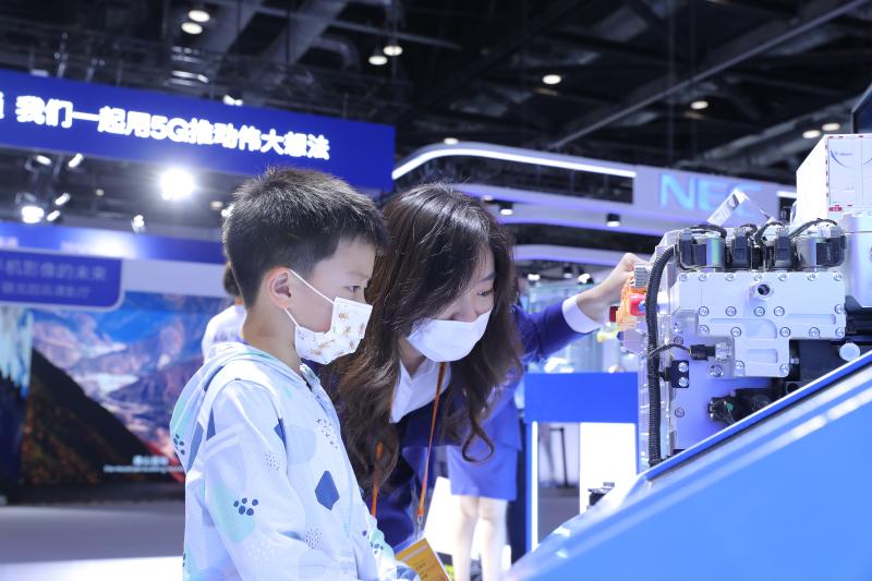 在服貿(mào)會現(xiàn)場,一個小男孩躲在奶奶身后好奇的地望著中國太保展臺上的氫能源發(fā)動機。