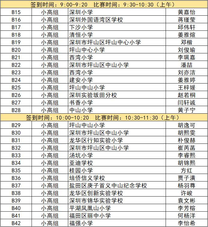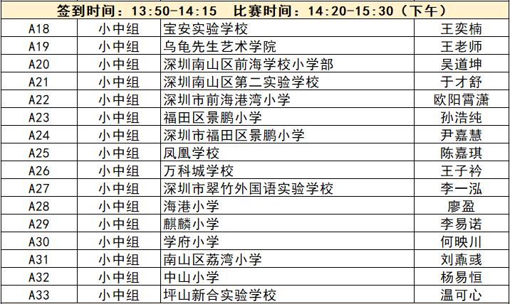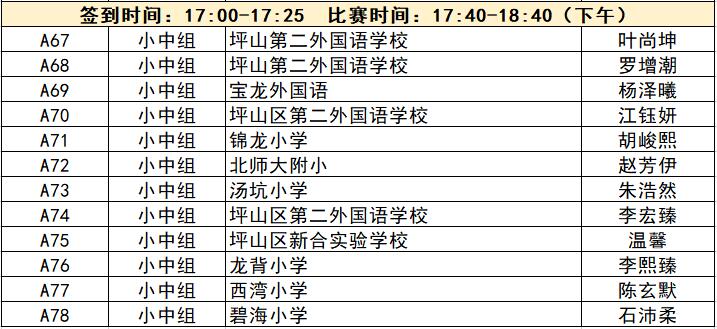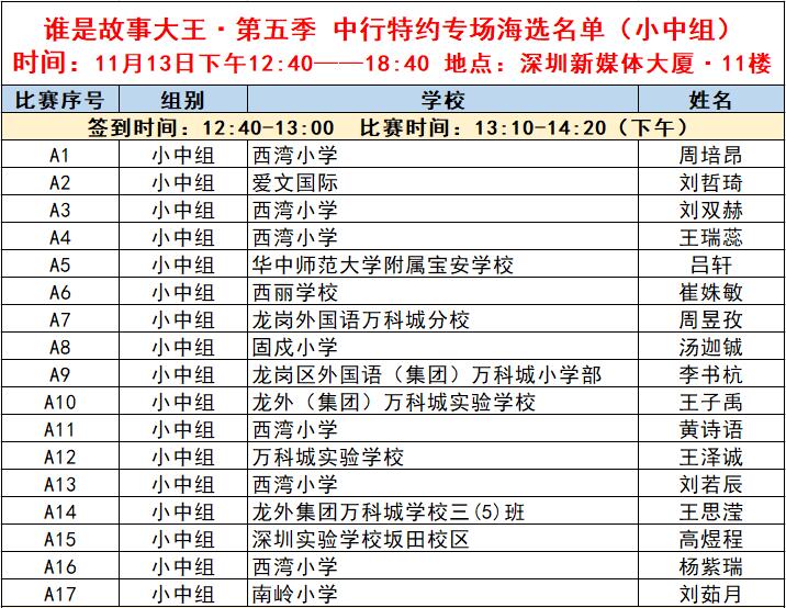 “誰是故事大王·第五季”分為小中組和小高組,此次中行特約專場海選報名的學(xué)生將以脫稿的形式,不限主題,在限時5分鐘內(nèi),講述積極健康向上的故事。評委老師們將從四個維度進行評分,其中內(nèi)容占50%、表現(xiàn)技巧占30%、儀態(tài)占10%,以及時間掌控、創(chuàng)意特色呈現(xiàn)等占10%。最終,本場活動將選拔出部分學(xué)生晉級“誰是故事大王·第五季”深圳市復(fù)賽,他們將和來自指定校園分賽區(qū)、特約專場以及線上分賽區(qū)的選手一起爭奪深圳市決賽名額。現(xiàn)將上場順序(即所在小組的序號順序)、名單、簽到時間、比賽時間公布如下: