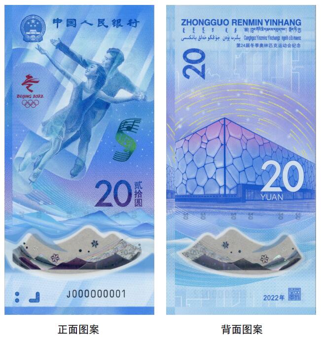 正面圖案:正面主景為花樣滑冰運(yùn)動(dòng)員圖案,上方為中華人民共和國(guó)國(guó)徽、“中國(guó)人民銀行”行名,左側(cè)為第24屆冬季奧林匹克運(yùn)動(dòng)會(huì)會(huì)徽,右側(cè)為光彩光變樂(lè)譜圖案、面額數(shù)字“20”與漢字“貳拾圓”,下方為動(dòng)感全息圖案、透明視窗、盲文面額標(biāo)記和冠字號(hào)碼。