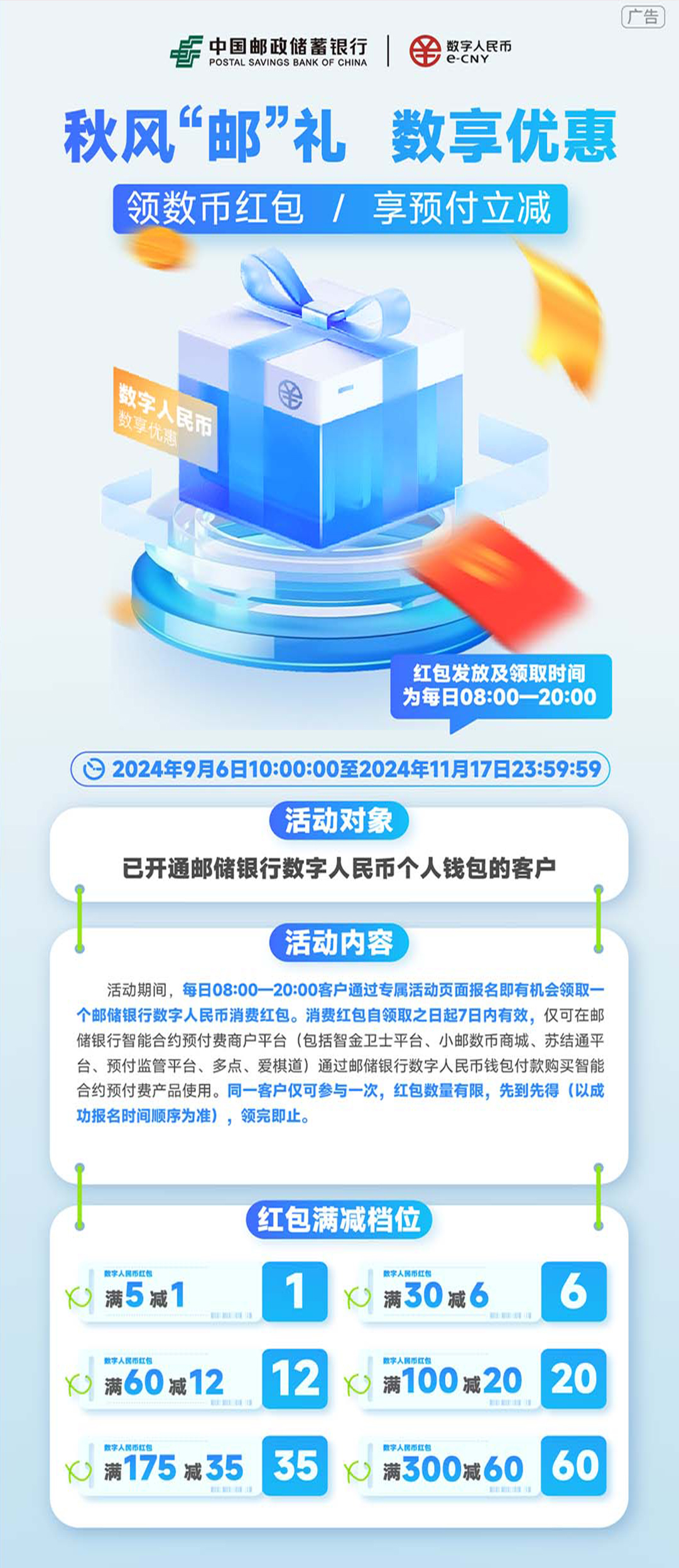2024年9月6日10:00至2024年11月17日23:59,已開通郵儲銀行數(shù)字人民幣錢包的客戶,活動期間,每日08:00-20:00客戶通過專屬活動頁面報(bào)名即有機(jī)會領(lǐng)取一個郵儲銀行數(shù)字人民幣消費(fèi)紅包。消費(fèi)紅包自領(lǐng)取之日起7日內(nèi)有效,僅可在郵儲銀行智能合約預(yù)付費(fèi)商戶平臺(包括智金衛(wèi)士平臺、小郵數(shù)幣商城、蘇結(jié)通平臺、預(yù)付監(jiān)管平臺、多點(diǎn)、愛棋道)通過郵儲銀行數(shù)字人民幣錢包付款購買智能合約預(yù)付費(fèi)產(chǎn)品使用。同一客戶僅可參與一次,紅包數(shù)量有限,先到先得(以成功報(bào)名時間順序?yàn)闇?zhǔn))領(lǐng)完即止。
