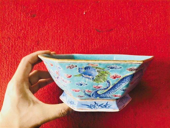 ▲清同治粉彩龍紋綠地六方果盤(pán)。吳冠甫 攝
