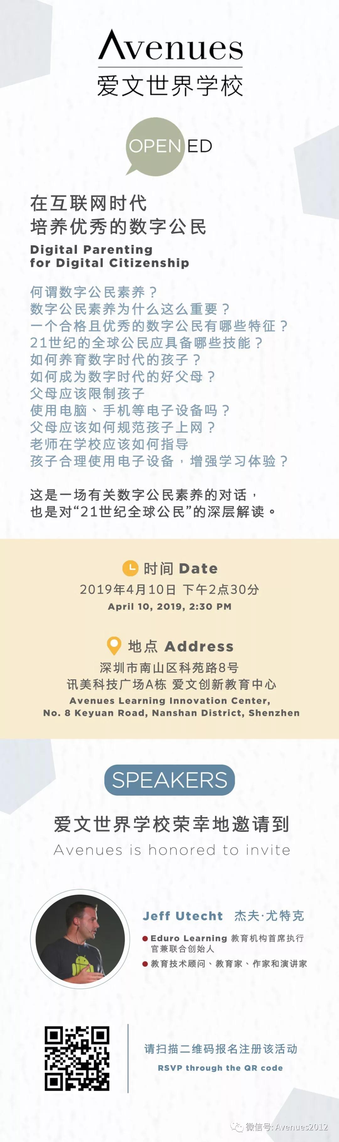 愛文世界學校專門邀請了知名的教育技術顧問、教育家、作家及演講家杰夫?尤特克 (Jeff Utecht),就數(shù)字公民素養(yǎng)話題進行深入探討,從何謂數(shù)字公民素養(yǎng),到數(shù)字公民素養(yǎng)的重要性,再到父母和老師如何培養(yǎng)孩子成為一位優(yōu)秀的數(shù)字公民。