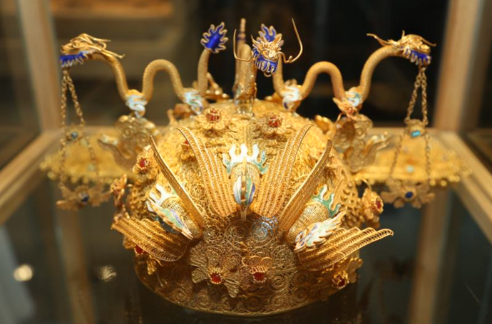 此次文博會(huì),楚釹子品牌展出鳳冠霞帔婚配系列、宅配梅蘭竹菊系列、佛像系列產(chǎn)品等近百余件。其中鳳冠霞帔系列作品,以巧妙的花絲鑲嵌技藝,糅合中國(guó)傳統(tǒng)技藝,融入現(xiàn)代婚紗設(shè)計(jì)理念,打造出流光溢彩、雍容華貴的現(xiàn)代宮廷藝術(shù)之美。