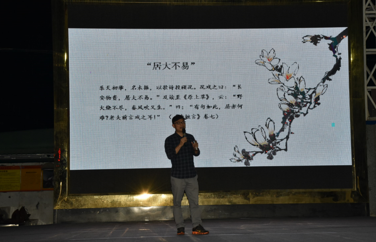 深圳新聞網(wǎng)訊 5月29日晚上,“新時代中華優(yōu)秀傳統(tǒng)文化進(jìn)社區(qū)”系列活動第三場公益文化講座之“月點波心一顆珠——白居易的詩意人生”在深圳市寶山技工學(xué)校寶山大舞臺拉開帷幕,由愛詩家創(chuàng)始人劉建彪帶領(lǐng)聽眾一同走進(jìn)“詩王”的詩意世界,感悟其至情至性。