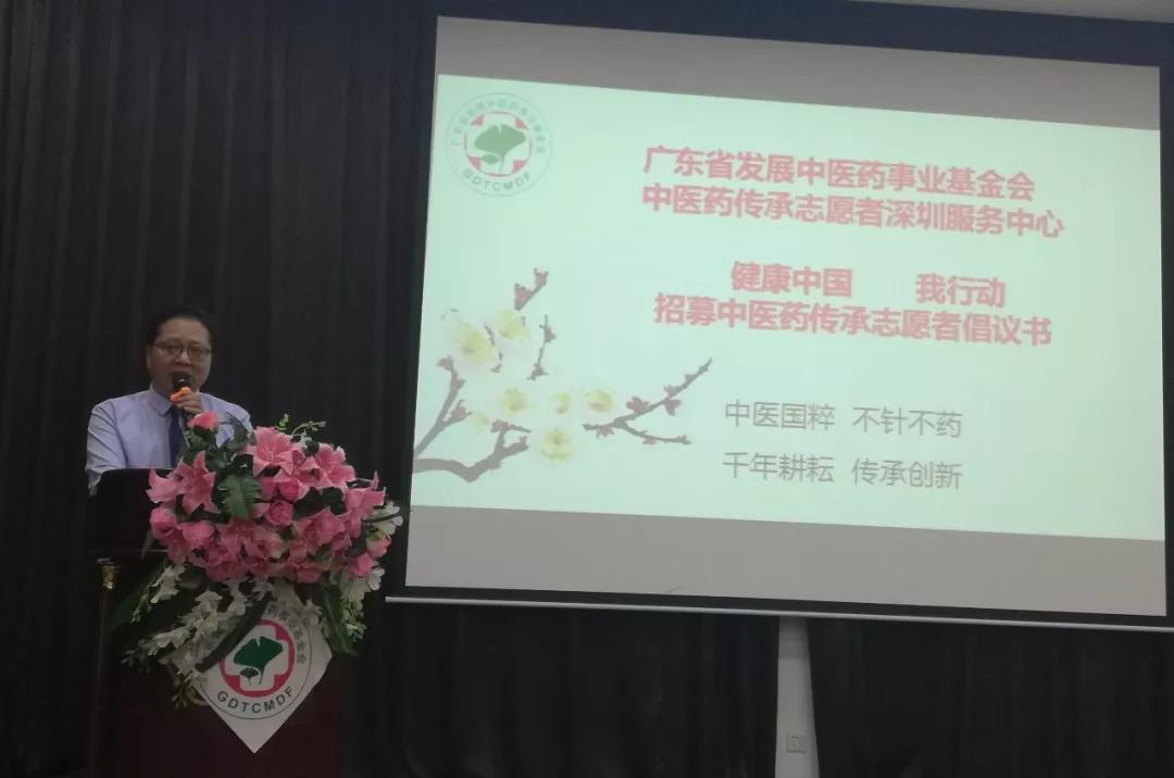 國家中醫(yī)藥管理局學(xué)術(shù)流派傳承推廣基地辦公室副主任,廣州中醫(yī)藥大學(xué)基礎(chǔ)學(xué)院副院長,廣東省發(fā)展中醫(yī)藥事業(yè)基金會賀振泉主任在大會對中醫(yī)藥傳承志愿者深圳服務(wù)站全體志愿者及組委會做出重要指示,要求志愿者們用學(xué)到的技能大力弘揚(yáng)中醫(yī)文化,傳播中醫(yī)技能,服務(wù)社會,回報社會,為深圳中醫(yī)藥傳承志愿者服務(wù)中心的成立表示祝賀。之后為中醫(yī)藥傳承志愿者深圳服務(wù)中心頒發(fā)了證書以茲鼓勵。中醫(yī)藥傳承志愿者(深圳)服務(wù)中心主任張東升,副主任龔明,林海彬接受證書任命。