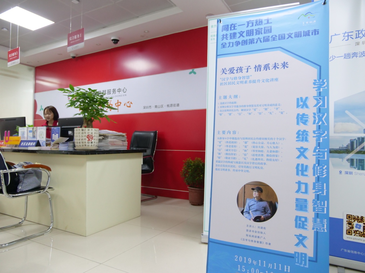 11月11日下午,本系列活動的第三場講座在平山社區(qū)工作站拉開了序幕,此次講座由桃源街道黨工委(辦事處)主辦、深圳市壹書文化傳播有限責(zé)任公司承辦、平山社區(qū)黨委協(xié)辦。從2005年起,深圳連續(xù)五次獲得“全國文明城市”的榮譽(yù)稱號,在爭創(chuàng)第六屆全國文明城市的關(guān)鍵時期,桃源街道辦積極響應(yīng)市委市政府的號召,堅(jiān)持求真務(wù)實(shí)的工作作風(fēng),以“‘同在一方熱土共建文明家園’——全力爭創(chuàng)第六屆全國文明城市”為文明創(chuàng)建標(biāo)語,開展題為“學(xué)習(xí)漢字與修身智慧,以傳統(tǒng)文化力量促文明”的文化講座,為創(chuàng)建文明城市貢獻(xiàn)一份力量。